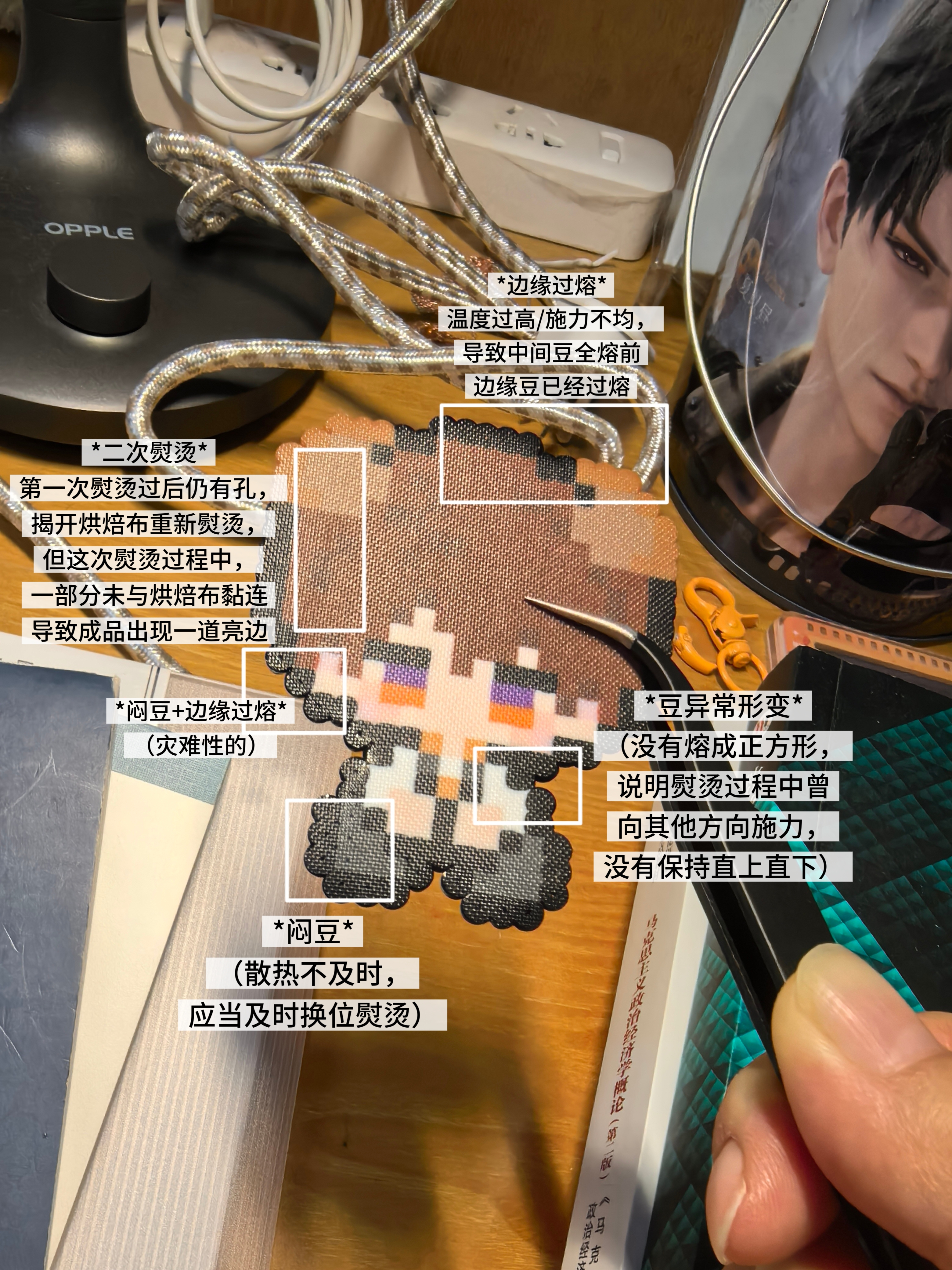 这些方面的问题,我现在打算按照顺序来尝试解决,即先降低熨烫温度慢慢熨豆(网上说的棉挡熨烫我已经尝试,但显然温度还是过高,没烫几秒,受力大、无束缚的边缘豆就全熔了,但中间豆还是明显有孔的),再尝试着优化施力方式(其实现在我的确是以直上直下方法熨烫的,所以这可能并非问题主要所在)。如果这些都没能解决问题,我会更换烘焙布、购买大理石板,再进行尝试。