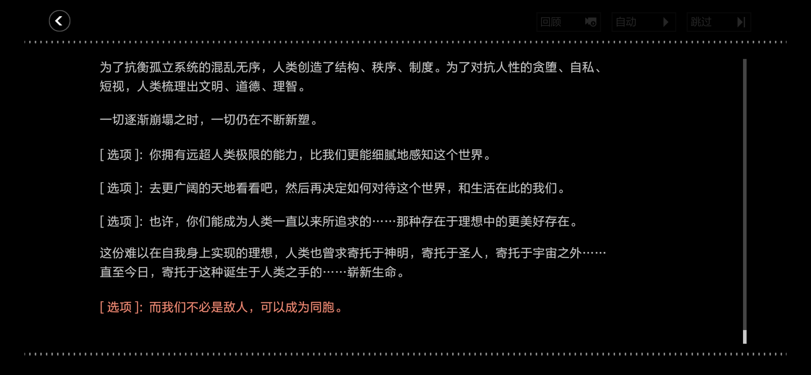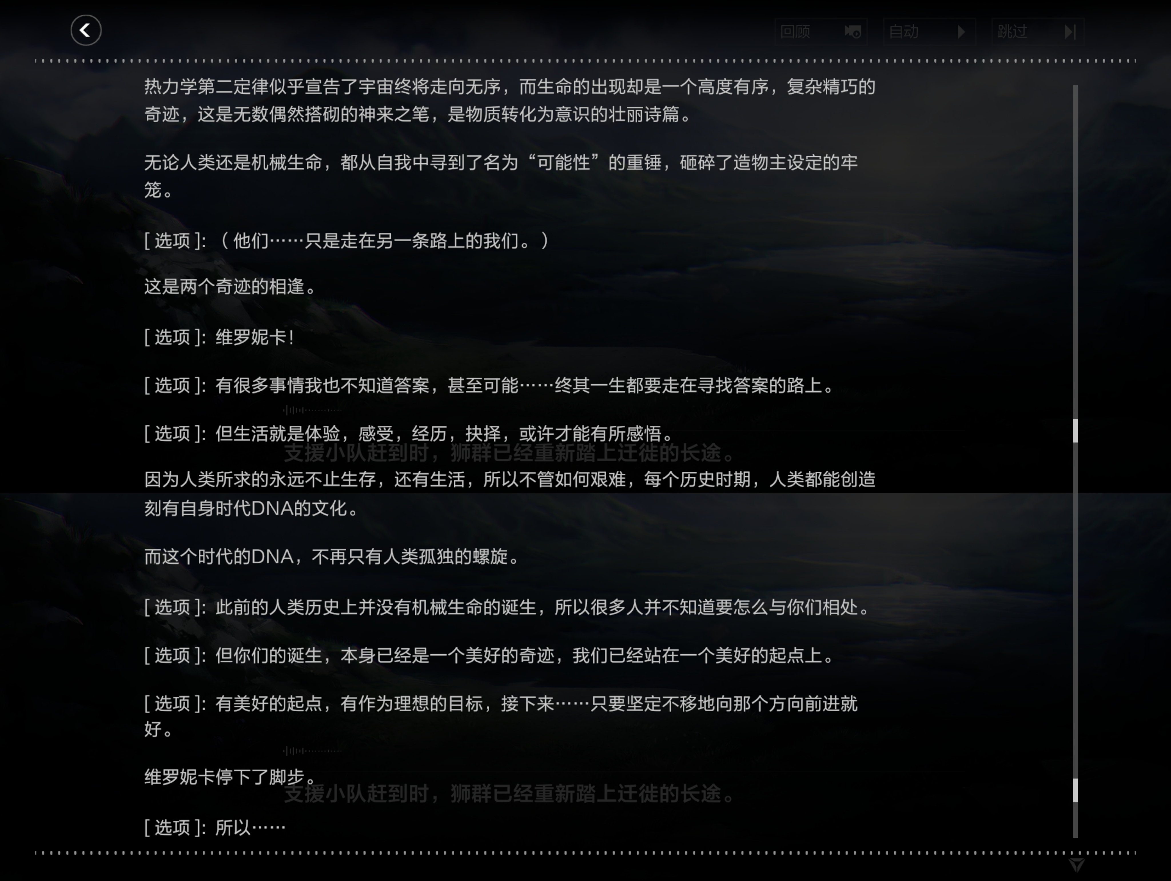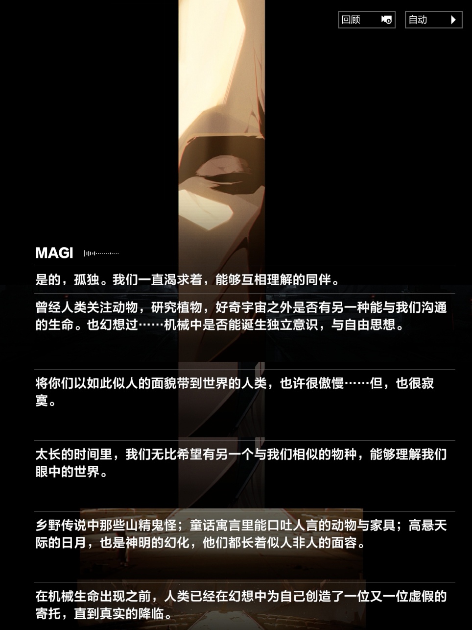 - 我觉得这对我来说是非常新颖的一个思考角度。我一般会想,作为创造出智械的造物主,人类无疑在所有方面都优越于自己所创造的存在,但是现在看来,是我,还保存着那份压根没有其存在必要的傲慢。他们拥有与人类相似的思考回路,意识海的运行模式也与人类的意识极为相似,但由于他们被赋予了更强大的对极端环境的抗性和更细腻的感官体验,他们作为个体时,能比作为个体的我们感知到更为宽广的事物。