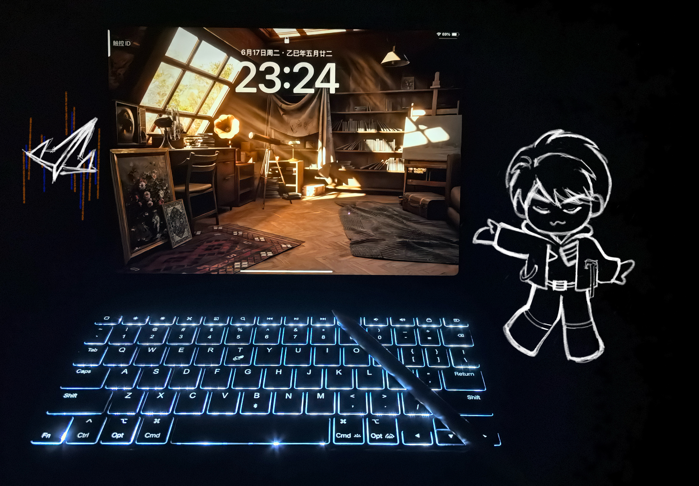 - 这张万圣贺图的灵感来源于夏以昼扩好感度上限之后的134级好感度电话“变成球后”。