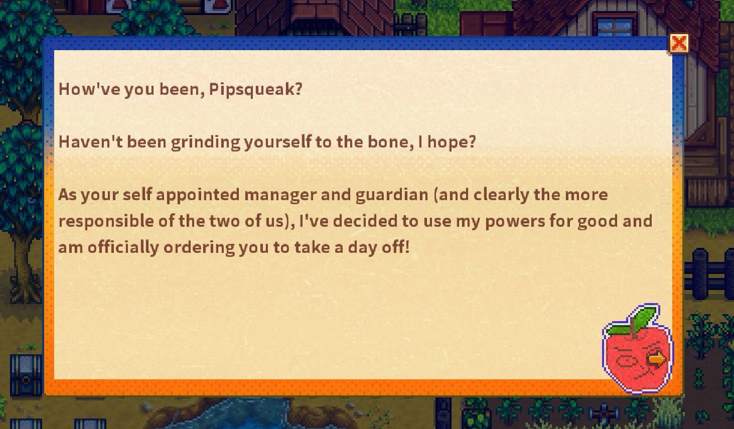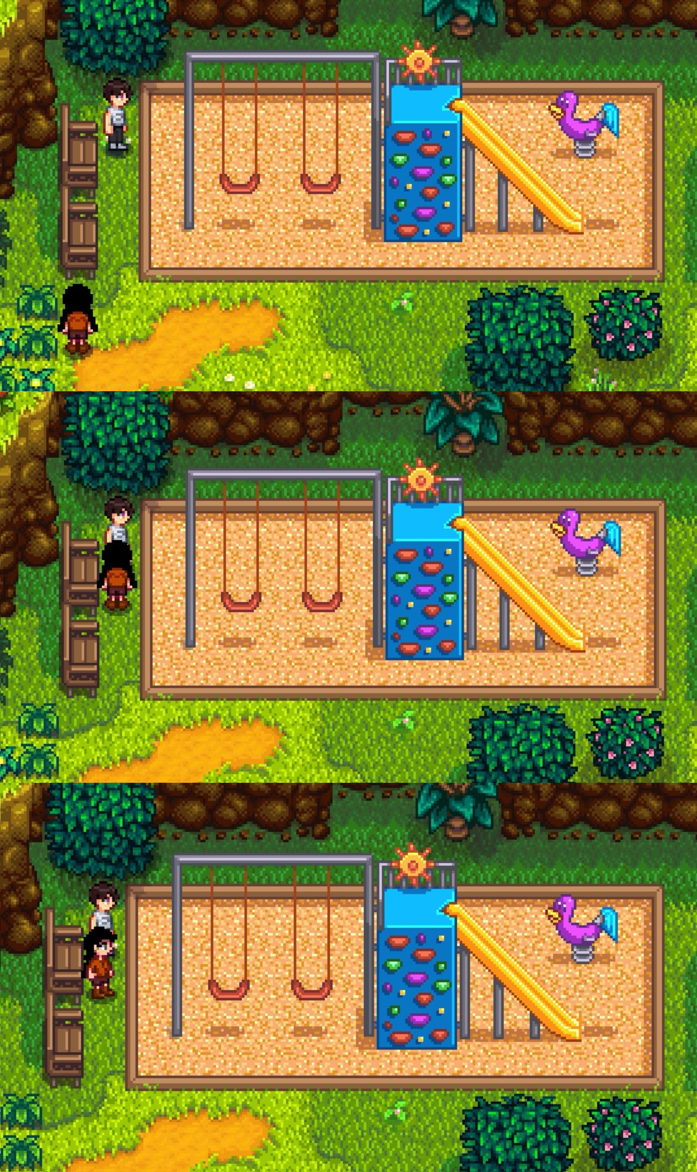 与夏以昼在鹈鹕镇的幸福生活·其之一 2025-12-09 二次 195 words XYZ星露谷端游 与夏以昼在鹈鹕镇的幸福生活·其之一 此为25年暑假期间装完这个MOD之后截出来的婚前辑。 似乎是某心好感度剧情,在小镇上的游乐场。 小时候一定会被哥哥推着荡秋千吧。他也会一遍一遍,不厌其烦,满足我拥抱蓝天的幼稚愿望。 似乎也是某心好感度剧情,是野餐pa。 旁边飞着很多美丽小蝴蝶!喜欢。 他在某日写来的信。 昏色之中。 桥边垂钓。 在格斯的小酒馆。 在我自己布置的房间。 我在床尾摆了一对太阳果。它们真的好可爱。 回味八月热果中 哥哥弟弟哥哥