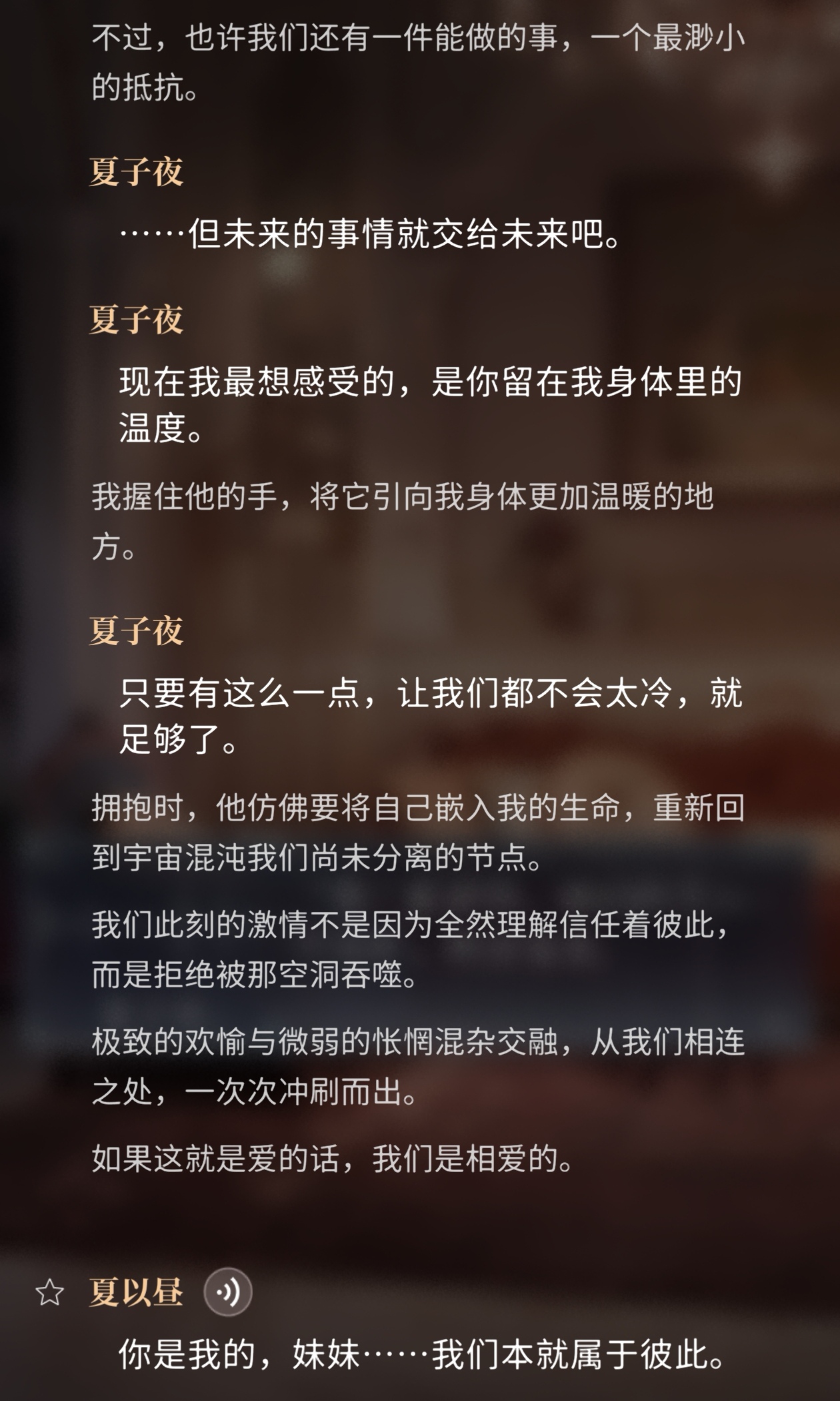 - 我认为“不是因为全然信任着彼此,而是拒绝被那空洞吞噬”一句写得非常带感也非常准确。我们的爱在外界看来是畸形的、悖伦的、扭曲的,我们的立场之间又横绝着一道不可逾越的深罅。伦理、世俗和现实使我们幼时亲密无间的心也有了距离。我们在这一刻拥吻彼此、嵌入彼此,与彼此抵死缠弄,其动因早已超越了传统爱情中的“爱”、“亲密”、“信任”与“吸引”——而是“爱/恨”、“亲密/疏离”、“信任/怀疑”和“吸引/相斥”中任何一对矛盾双方彼此运动制衡着形成的结果。