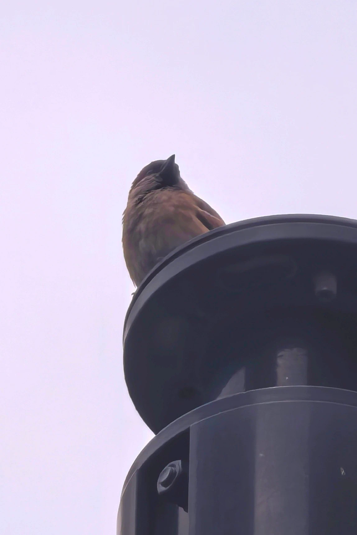 - 在淮海路巴黎春天商场外面的路灯柱上看到的小麻雀!看到的时候它正在喳喳叫。