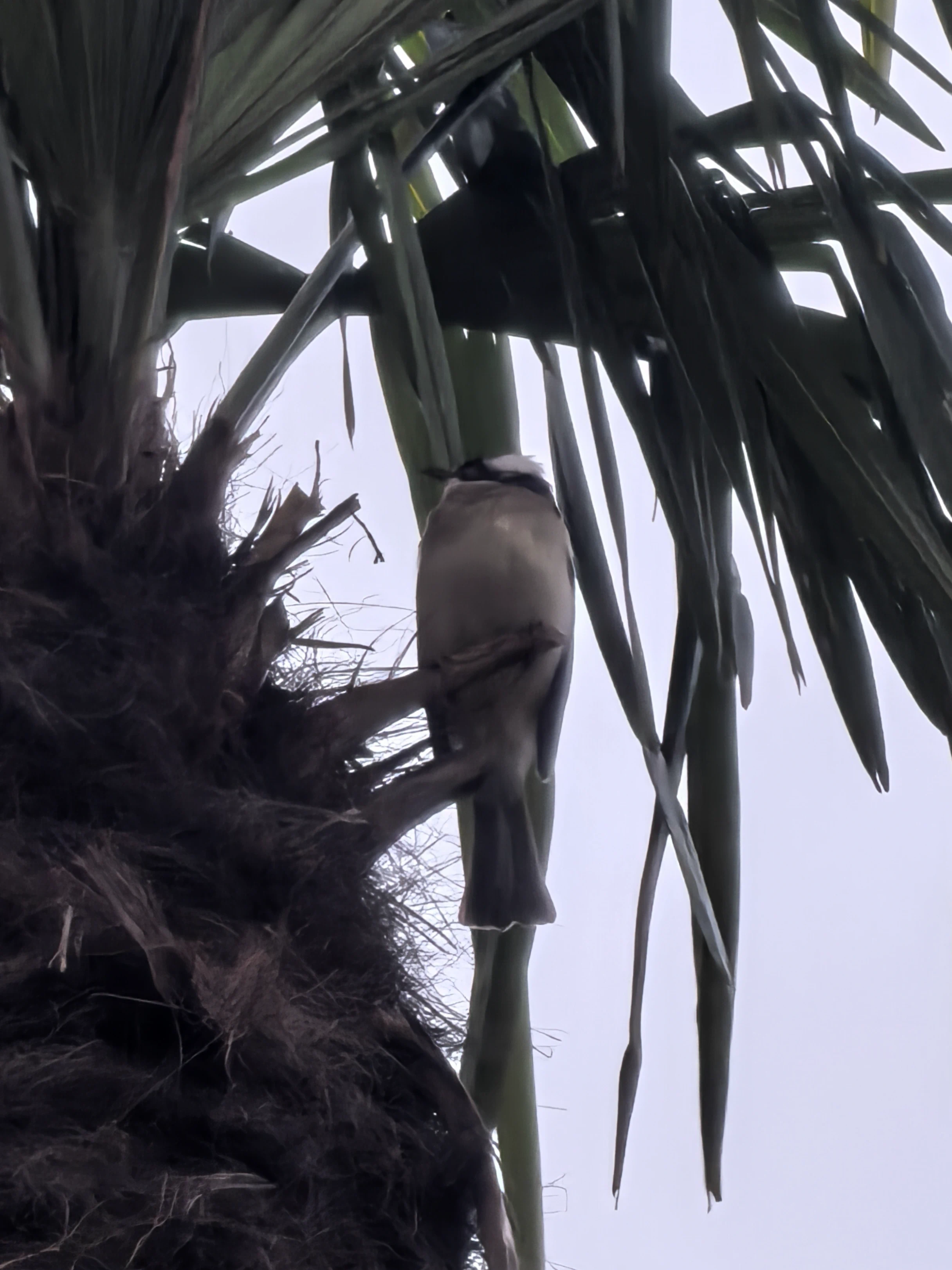 - 从寝室楼后面绕去外卖柜时看到的停在华盛顿棕榈上的白头鹎。宝鹎可爱捏!