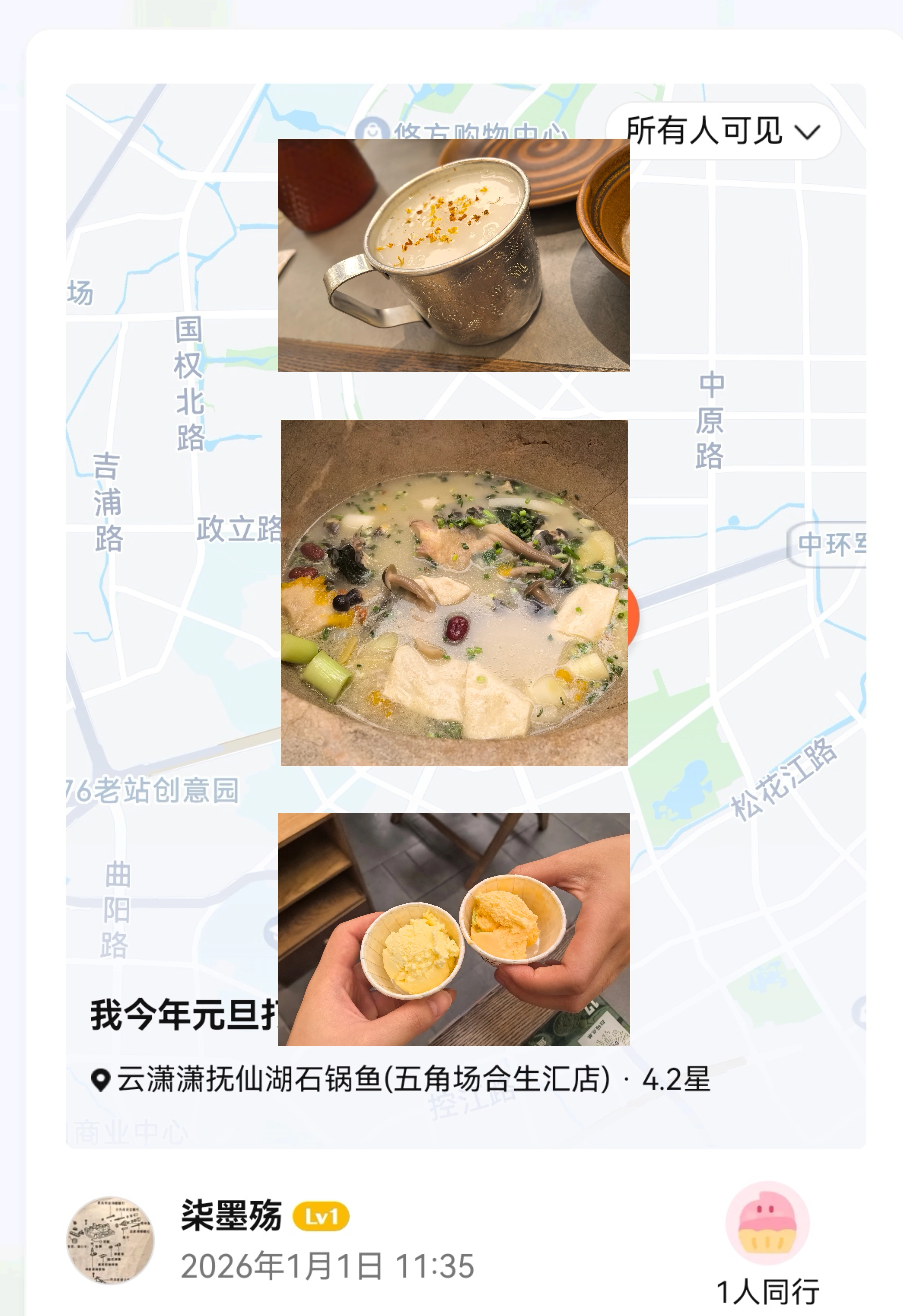 - 以及当天中午我们一起在五角场打卡的云潇潇石锅鱼。我喜欢鲟鱼的骨头,treetree的很好吃!