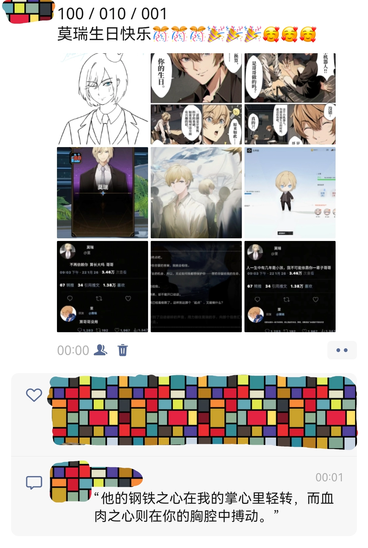 莫瑞·2026生日 2026-04-21 个人二创 105 words Murray战双帕尼尼手游生贺 26.04.21/ 100 / 010 / 001/祝莫瑞生日快乐!!! 补上一条0:00在QQ和微信公域准时发布的生贺帖子(因为QQ和微信内容完全一模一样,所以这里只展示微信了): 观鸟鸟鸟vol.13